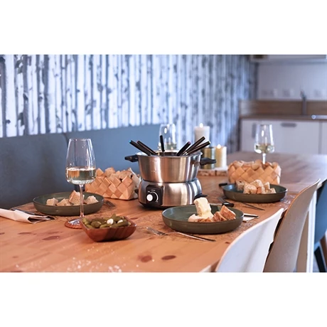 Cet appareil à fondue électrique 1,8 L 8 personnes 1000 W sera l’artisan de toutes vos fêtes conviviales. Il combine en effet en un seul appareil la possibilité de réunir 8 convives autour de trois recettes festives : la fondue bourguignonne à base de viande, la fondue savoyarde au fromage et la fondue au chocolat. Trois recettes mais une règle unique : celui qui laisse tomber son morceau de viande, de pain ou de fruit dans le caquelon a un gage !