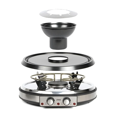 Avec cet appareil à raclette grill et fondue 8 personnes 1900 W DOC265 Livoo, vous ne choisirez plus entre raclette et fondue ! Les deux simultanément permettent d’utiliser les deux fonctions simultanément. Pour la fonction fondue, le bol à revêtement antiadhésif de 0,7 L est doté d’une collerette anti-éclaboussures. Vous l’utiliserez avec 8 fourchettes, chacune dotée d’un embout de couleur pour que les convives puissent les identifier.