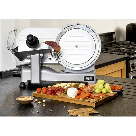 Cette trancheuse électrique possède une lame affutée de haute qualité de 25 cm en acier inox, idéale pour couper et trancher avec précision de nombreux aliments : charcuterie, fromages, légumes, pain… Pratique et efficace, elle s’utilise quotidiennement. Son chariot de belle dimension offre une longueur de coupe de 19 cm. Précise, elle se règle suivant l’épaisseur de coupe souhaitée de 0 à 1,5 cm. Cette trancheuse est très pratique pour réaliser des chiffonades de jambon ou des tranches de fromage à raclette !