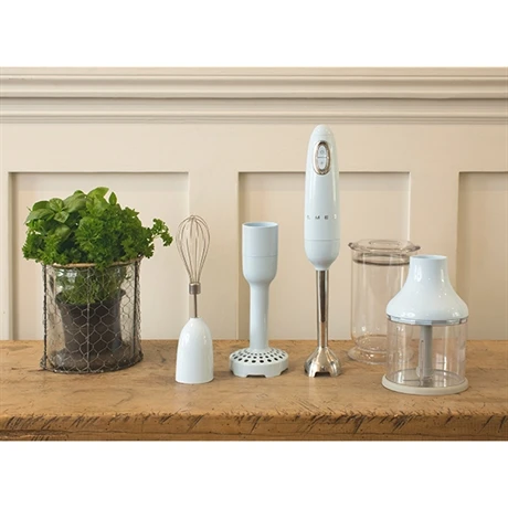 Le mixeur plongeant est un appareil de petit électroménager pratique au quotidien et peu encombrant. Smeg vous propose un mixeur plongeant accompagné de 4 accessoires pour un grand nombre d’opportunités d’utilisations. Le mixeur HBF22PBEU 700 W bleu azur est puissant, durable et esthétique.