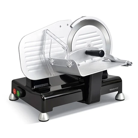 La trancheuse électrique noir s’avère puissante, rapide et silencieuse grâce à son moteur asynchrone 110 W de type professionnel. Son corps en fonte d’aluminium laqué noir avec un plateau anodisé incliné sont garants de sa robustesse et facilitent son nettoyage. Elle dispose d’un large plateau (19 x 16 cm) vous assurant de placer facilement le jambon ou toute autre pièce à trancher et vous offre une longueur de coupe de 20 cm et une hauteur de coupe de 15 cm. Son bras articulé est composé de doubles picots en aluminium pour un maintien efficace des aliments. La lame est entièrement protégée par un carter et ce dispositif de sécurité est renforcé par les quatre pieds en aluminium antidérapants soutenant l’appareil, ils suppriment les risques de chutes ou d’instabilités et empêchent également les vibrations pour un meilleur confort d’utilisation.