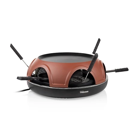 Avec une puissance de 1800 W et un élément chauffant à double boucle, il permet de cuire les différentes préparations en un rien de temps. Doté d’une plaque chauffante généreuse d’un diamètre de 25 cm, il se montre parfait pour assurer la cuisson des grillades de six personnes. L’appareil est fourni avec six pelles à pizza, six poêlons à raclette, un pour chaque ouverture et un emporte-pièce afin de découper facilement les disques de pâte à la taille des pelles ; à vous de choisir la garniture à déposer sur votre mini-pizza ou la tranche de fromage à faire fondre pour napper votre pomme de terre. Côté sécurité, un témoin lumineux indique son fonctionnement tandis que quatre pieds antidérapants lui confèrent une bonne stabilité sur la table.